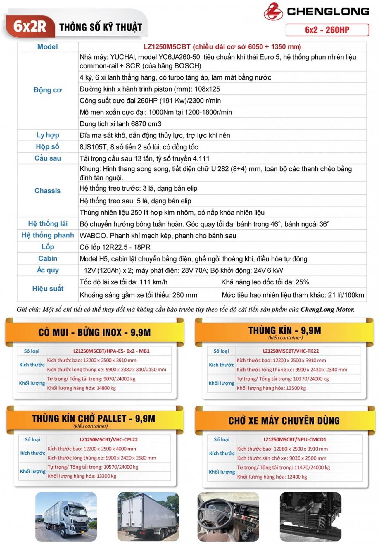 Xe tải Chenglong 3 chân thùng dài 9,9 m được trang bị động cơ Yuchai 260Hp tiêu chuẩn khí thải Euro 5 tiên tiến, dung tích làm việc 6.8L mạnh mẽ, tiết kiệm nhiên liệu. Đi kèm với khối động cơ Yunchai là hộp số Fast Fuller với 8 số tiến và hai số lùi. Với ngôn ngữ cabin dạng thác nước chảy, H5 có tính khí động học cao, đem lại cảm giác thân thiện, khoẻ khoắn và hiện đại.